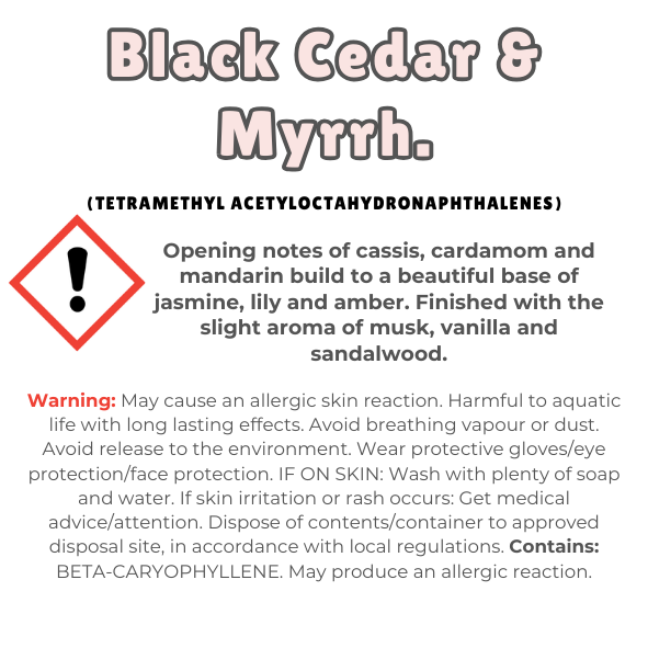 Black Cedar & Myrrh Wax Melt Snap Bar starts with initial notes of cassis, cardamom, and mandarin, guiding you towards a harmonious heart filled with jasmine, lily, and amber. Subtle hints of musk and vanilla, embraced by sandalwood, contribute to the overall complexity of this fragrance.